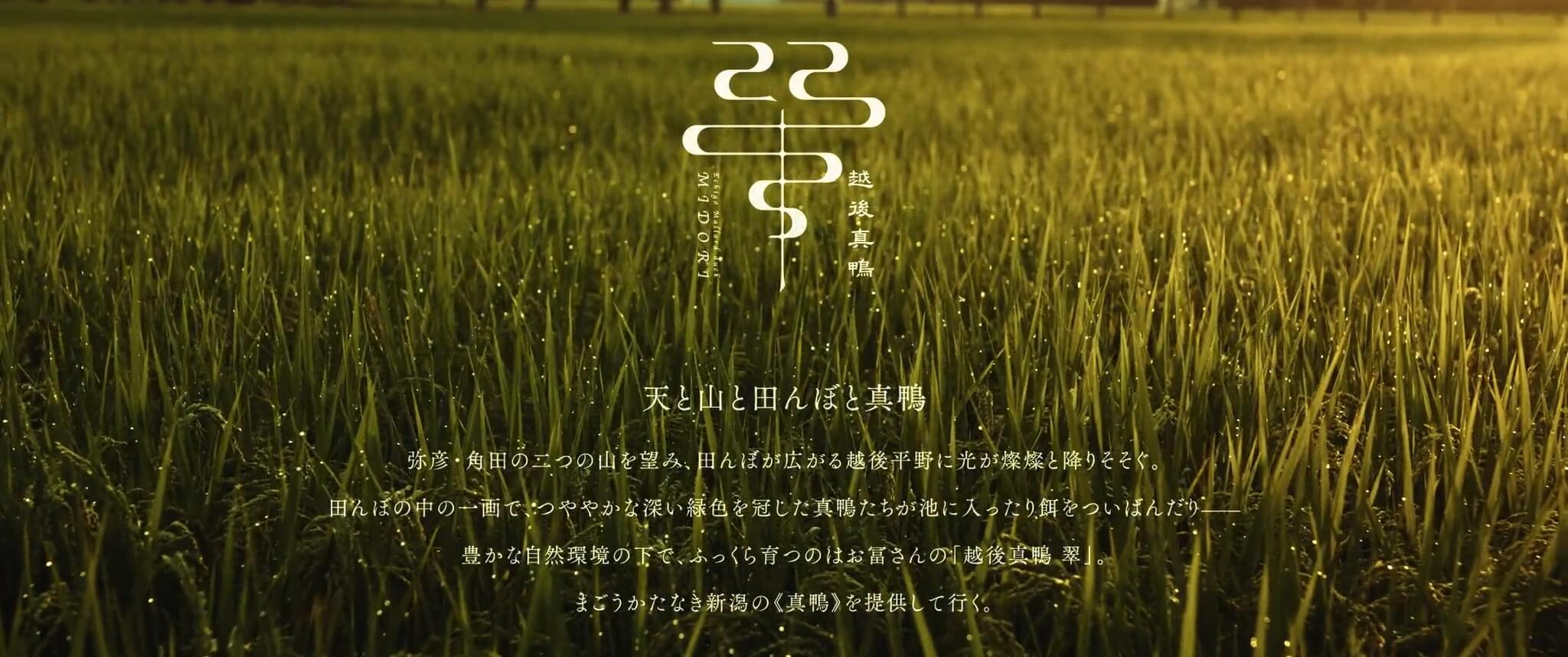 真鴨の養殖技術を未来へつなぐ新ブランド「越後真鴨 翠(みどり)」。WEBサイトのメインビジュアルとしてブランドムービーを制作しました。雄大な新潟の自然に生き生きと育つ鴨の姿を重ね、土地とともに歩むブランドの物語を映像で表現しています。