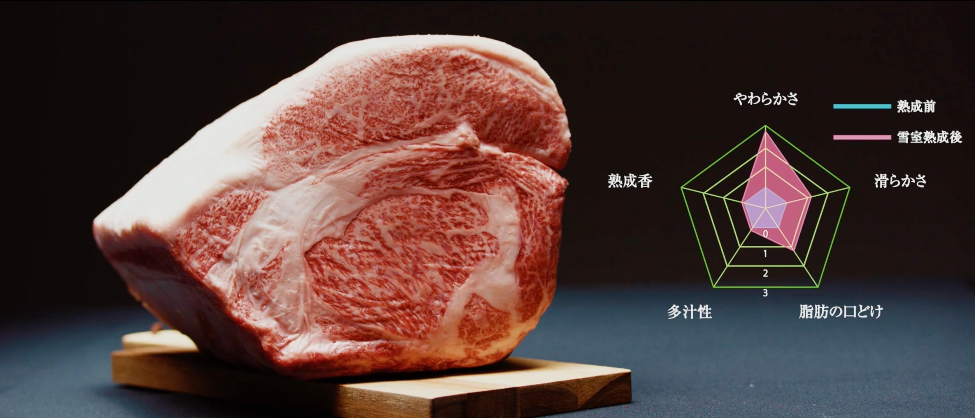 新潟市に本社を構えるウオショク。新潟県産を中心に食肉製造販売を手掛け、自社ブランド開発にも力を入れています。その一つ「雪室熟成和牛」は、アジア各国やアメリカにも輸出されている商品。今回は海外展開に一層力を入れるべく、プロモーション動画の制作をご依頼いただきました。「天然の冷蔵庫」と言われる雪室。その中でゆっくりとエイジングさせた牛肉は、柔らかさとうま味が格段に増すことが特長。高価格帯の商品であるため、ハイエンド層に向けた商品を探す海外バイヤーの目に留まるような動画を目指します。そして食品の安全性を表現するために、生産者のインタビューや衛生管理の行き届いた加工場のシーンも織り交ぜて構成しました。
